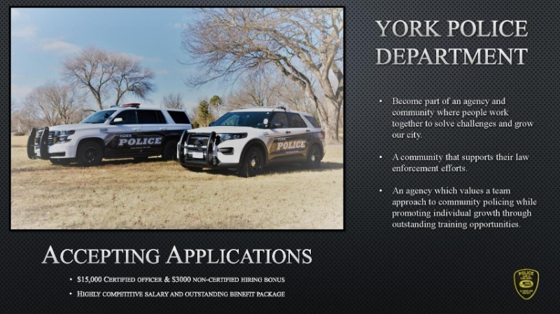The York Police Department is now hiring! Scheduling allows a three-day weekend every other weekend. Very competitive pay - and a great team!