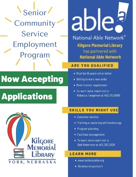Kilgore Memorial Library has partnered with National Able Network to create part-time employment opportunities for individuals 55 or better who meet income guidelines. To learn more about qualifying guidelines, call Rebecca Tangeman at . . .