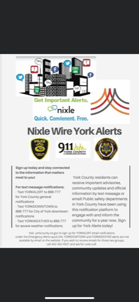 Stay Alert!!! Don’t forget to sign-up for Nixle Wire York Alerts! It’s a great way to be alerted about Advisories, Weather Alerts, Community Updates and Official Information!