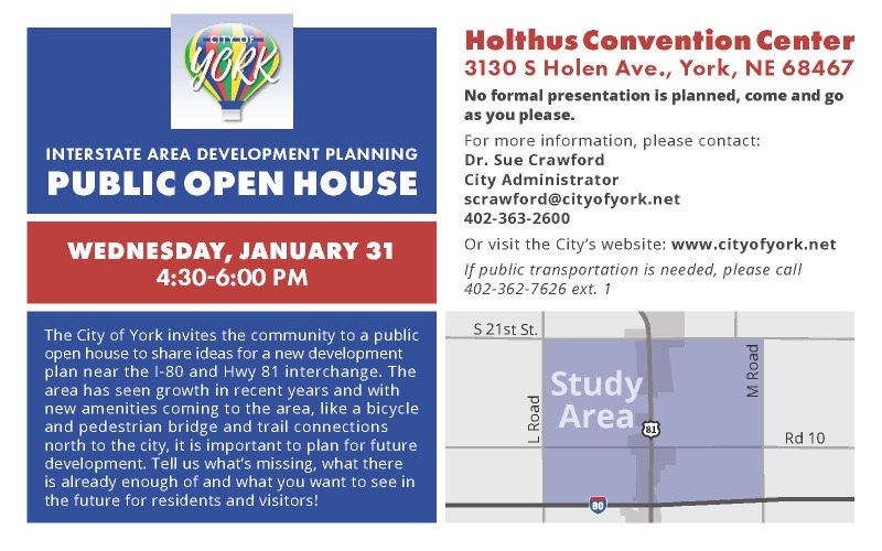 Come be a part of shaping the future of York! See possible future ideas for the area by the interstate interchange and give your input. All ages welcome! Interchange Area Public Input Session - January 31 - 4:30 to . . .