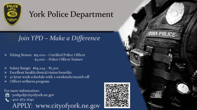 Applicants must be at least 21 years of age, have a high school diploma or equivalent and have the ability to obtain a valid Nebraska Driver’s License. Applicants must pass a background check, a pre-employment drug screening, and undergo a series of written, physical, and psychological tests. Officers of the York Police Department are required to live in York County.